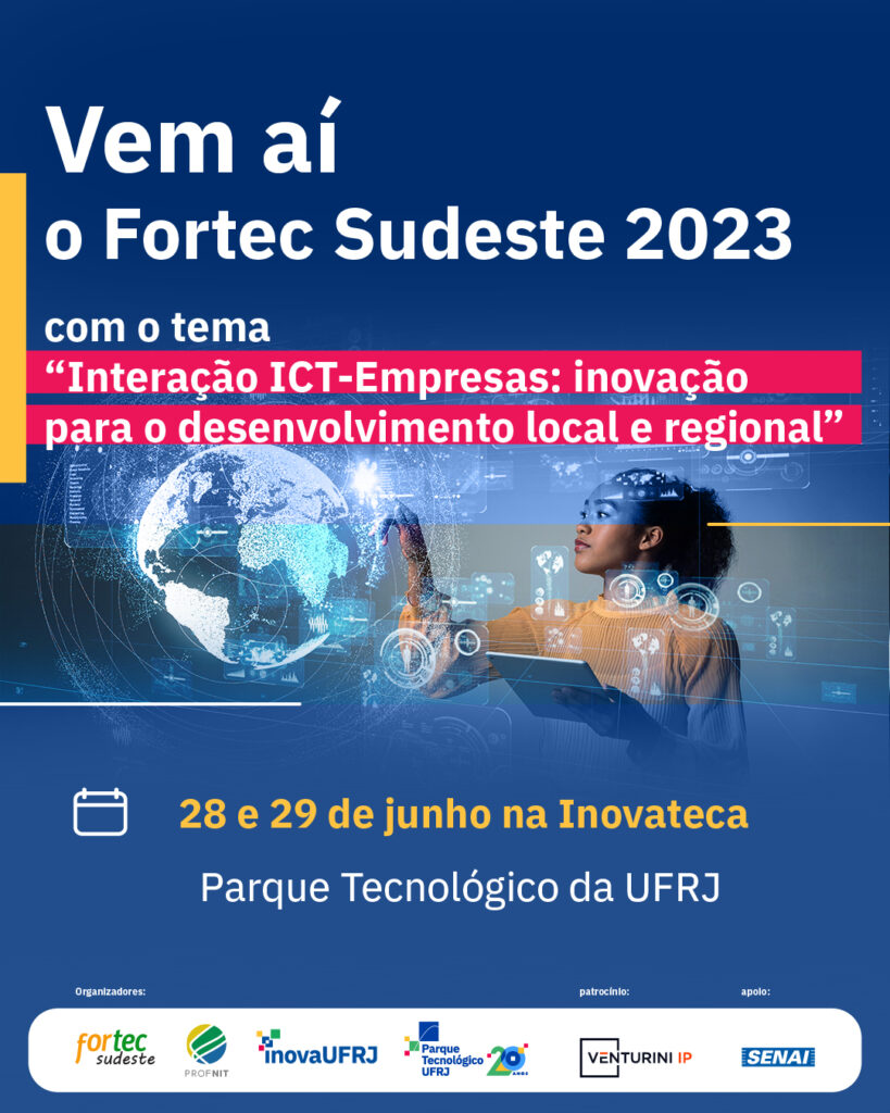 Nos dias 28 e 29 de junho, o Parque Tecnológico da UFRJ irá receber o Encontro Fortec Sudeste 2023. O Fórum Nacional de Gestores de Inovação e Transferência de Tecnologia é realizado pelo Fortec Sudeste, pelo PROFNIT, Pela Inova UFRJ e pelo Parque Tecnológico da UFRJ e terá como tema Interação ICT-Empresas: inovação para o desenvolvimento local e regional.